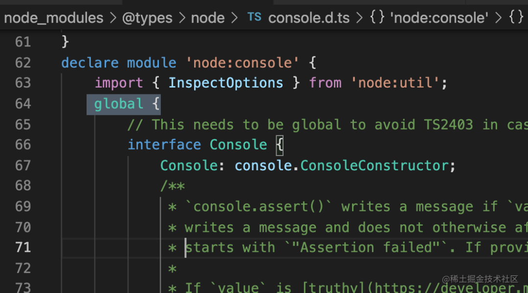 dts 的类型声明默认是全局的,除非有 es module 的 import、export 的声明,这时候就要手动 declare global 了。为了避免这种情况,可以用 reference 的编译器指令。