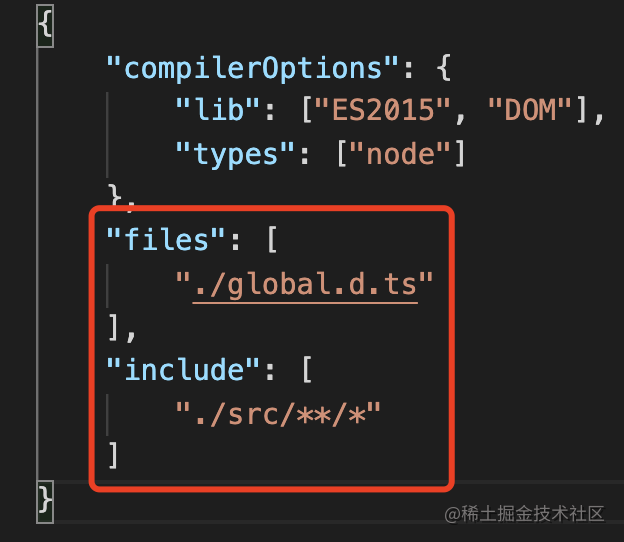 include 配置 src 下的 ts 文件,然后再用 files 引入 global.d.ts 文件: