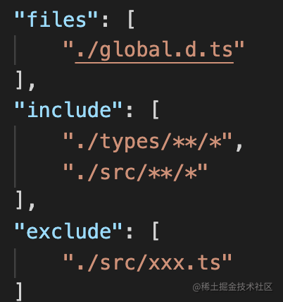 这些其实我们经常配置,就是配置下编译的入口文件,通过 include 指定一堆,然后通过 exclude 去掉一部分。还可以通过 files 再单独包含一些: