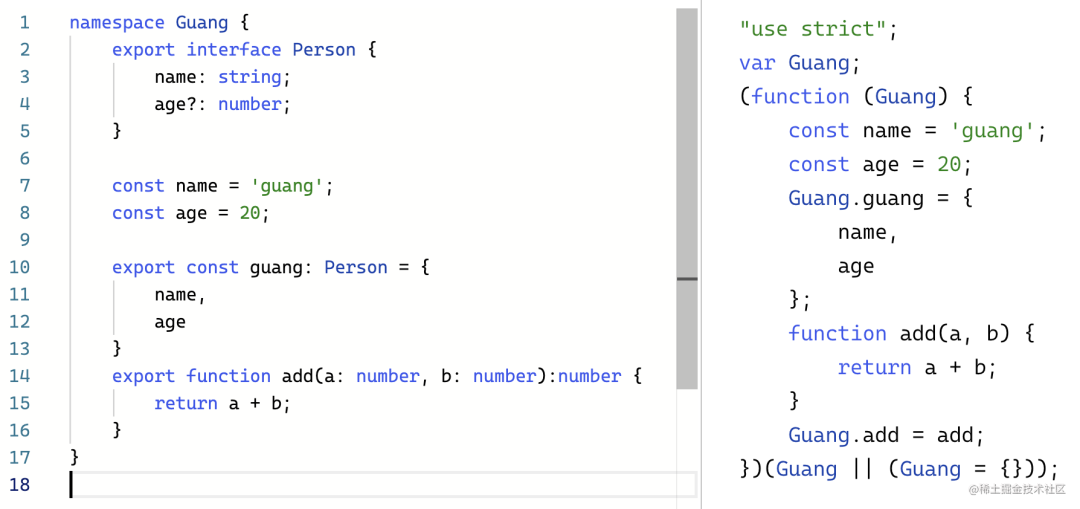 namespace Guang { export interface Person { name: string; age?: number; } const name = 'guang'; const age = 20; export const guang: Person = { name, age } export function add(a: number, b: number):number { return a + b; }}理解 namespace 的话可以看一下编译后的代码: