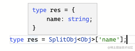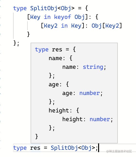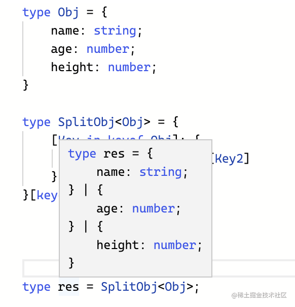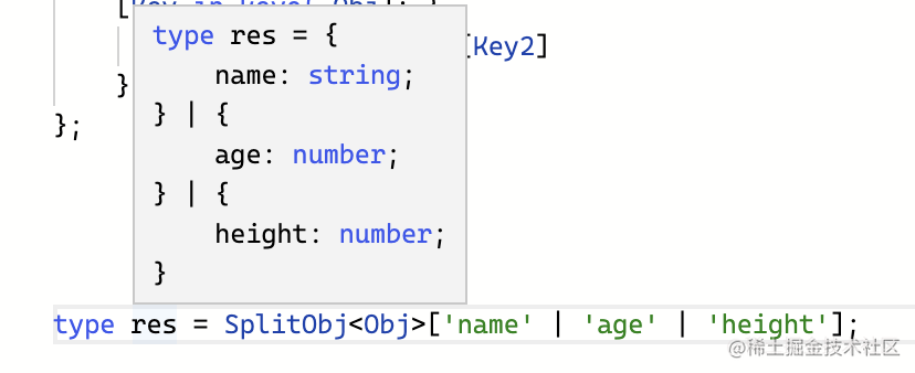 type SplitObj<Obj> = { [Key in keyof Obj]: { [Key2 in Key]: Obj[Key2] }}[keyof Obj];先看结果: