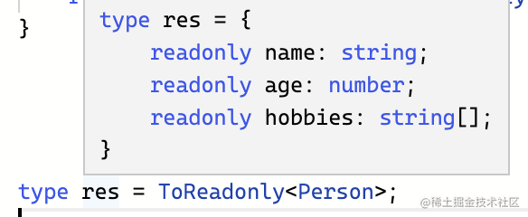 type ToReadonly<Obj> = { readonly [Key in keyof Obj]: Obj[Key]}返回的就是修改后的索引类型: