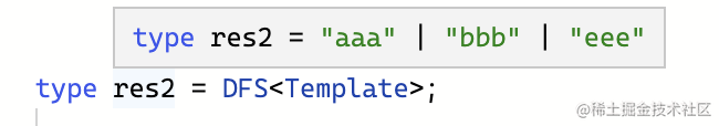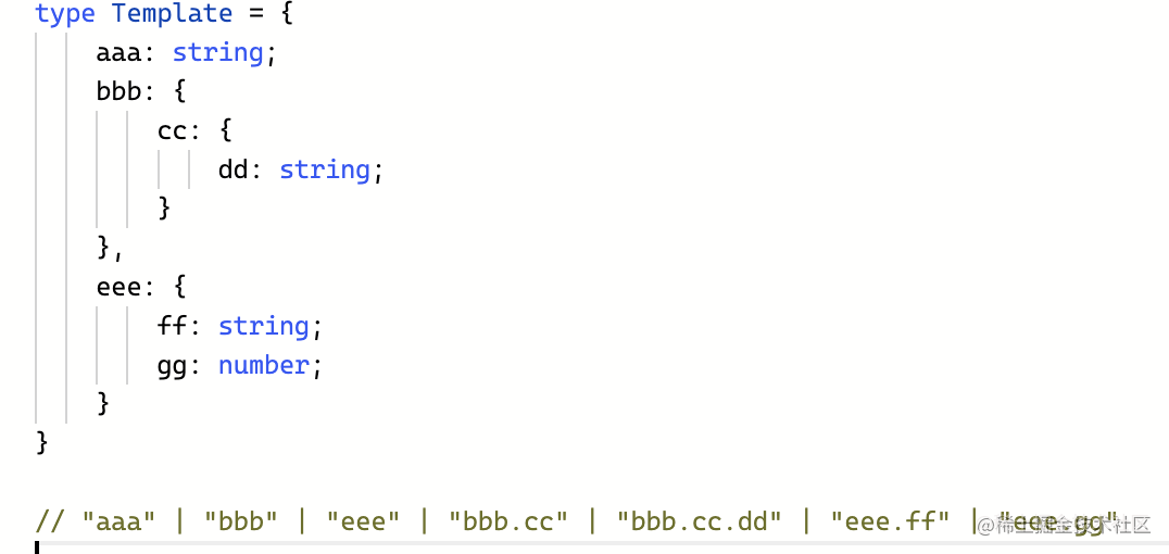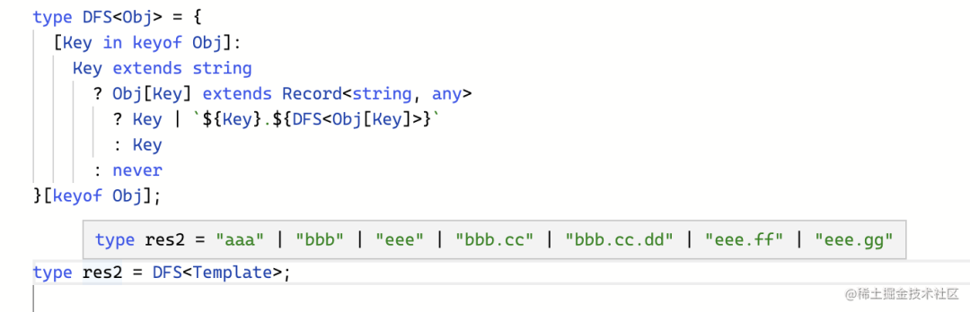 type DFS<Obj> = { [Key in keyof Obj]: Key extends string ? Obj[Key] extends Record<string, any> ? Key | `${Key}.${DFS<Obj[Key]>}` : Key : never}[keyof Obj];这里因为 Key 默认推导出来的不是 string,所以加一层 Key extends string 的判断之后,再用 Key 的时候就是 string 了。