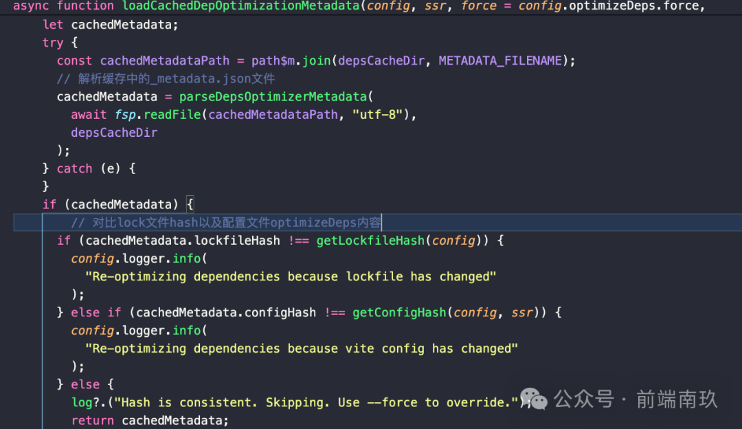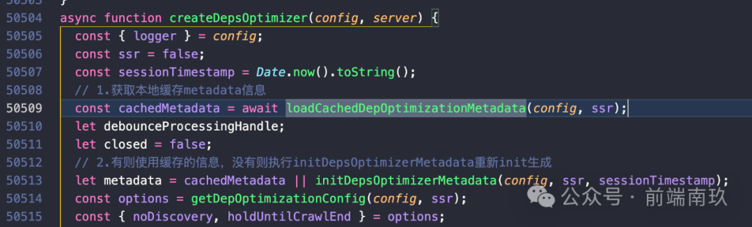 这里首先会去执行loadCachedDepOptimizationMetadata用于获取本地缓存中的metadata数据