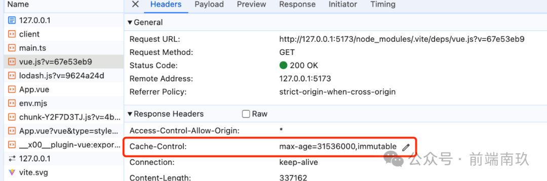 对于预构建产物的请求,Vite会设置为强缓存,有效时间为 1 年,对于有效期内的请求,会直接使用缓存内容
