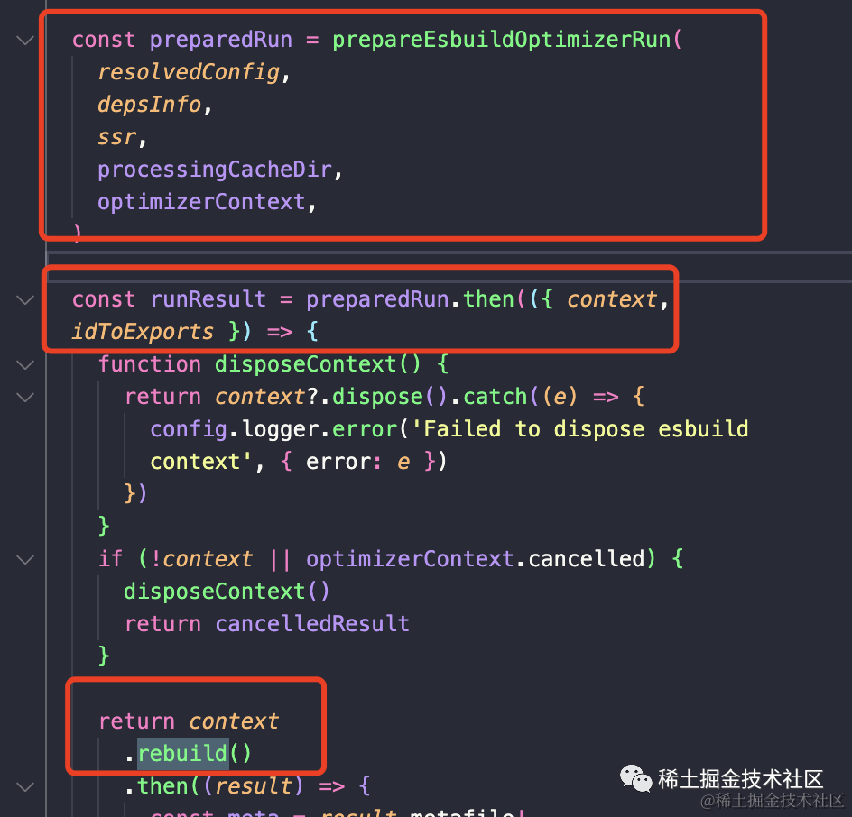 当 context 准备完毕后,prepareEsbuildOptimizerRun 会调用 rebuild 方法进行打包(生成预构建产物):