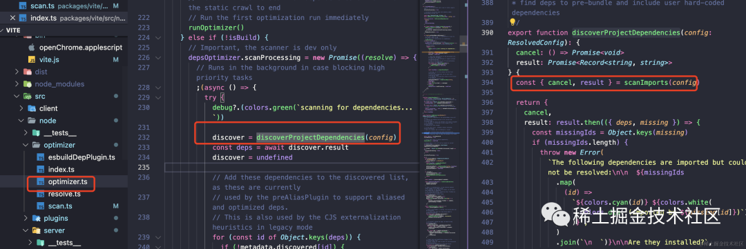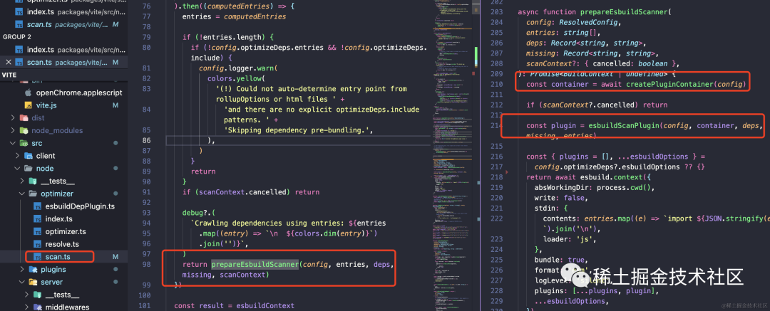 编辑器左边部分为 scanImports 方法,他会返回 prepareEsbuildScanner 方法的返回值。