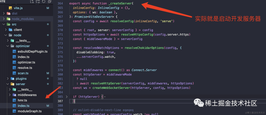 #!/usr/bin/env nodeimport { createServer } from '../src/server';(async function () { const server = await createServer(); server.listen('9999', () => { console.log('start server'); });})();上边的 /bin/vite 文件中,我们从 /src/server 中引入了一个 createServer 创建开发服务器的方法。