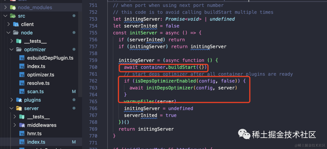 所谓 container.buildStart 正是我们之前提到过的 vite 内部有一套自己的插件容器。vite 正是通过这一套插件容器来处理开发模式和生产模式的区别。