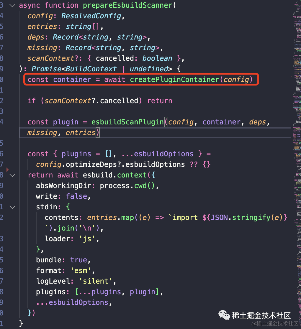在 prepareEsbuildScanner 在与预构建过程同样会创建一个插件容器,这正是我们上述简易版 Vite 中创建的插件容器。