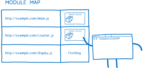 当加载程序获取一个 URL 时,它将把该 URL 放入模块映射中,并记下它当前正在获取文件。然后它将发出请求并继续以开始获取下一个文件。