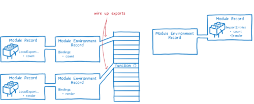 首先,JS 引擎创建一个模块环境记录。这将管理模块记录的变量。然后,它将在内存中找到所有导出的框。模块环境记录将跟踪与每个导出关联的内存中的哪个框。