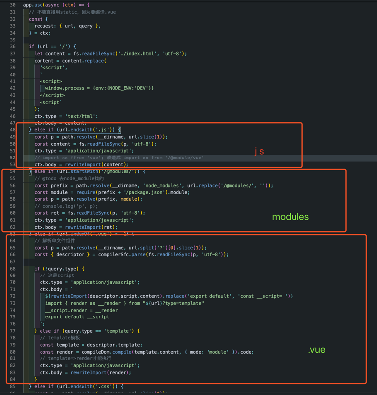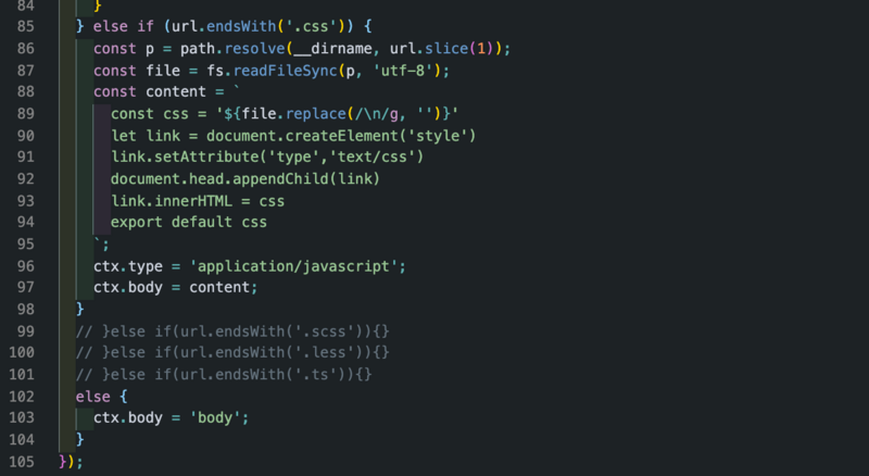 const fs = require('fs'); const path = require('path'); const Koa = require('koa'); const compilerSfc = require('@vue/compiler-sfc'); const compileDom = require('@vue/compiler-dom'); const app = new Koa(); // 处理引入路径 function rewriteImport(content) { // ... } // 处理文件类型等, 比如支持ts, less 等类似webpack的loader的功能 app.use(async (ctx) => { // ... } app.listen(3001, () => { console.log('3001'); });
