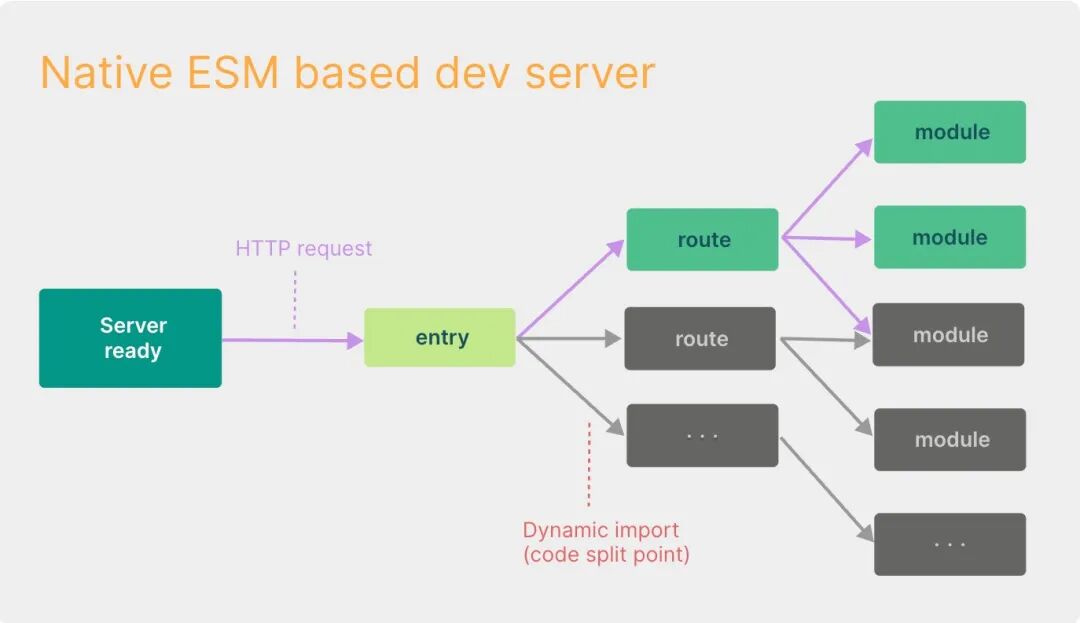 基于浏览器原生 ES 模块支持:Vite 利用了现代浏览器对 ES 模块(ESM)的原生支持,采用的是一种 no bundle 的策略,当使用 Vite 启动项目时,它会将每个模块都作为一个独立的文件提供给浏览器,而不需要像传统的打包工具(如 Webpack)那样先将模块打包成一个或多个 bundle。这样一来,浏览器可以更快地加载和解析这些模块,从而实现了快速的冷启动速度。