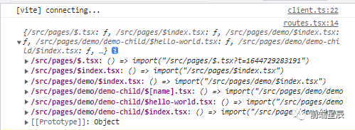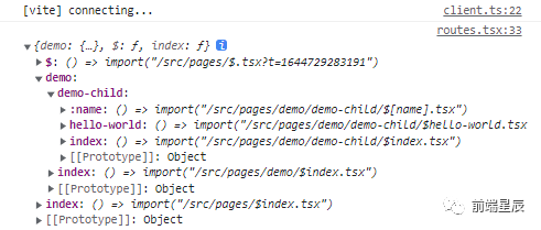import { set } from 'lodash-es';/** * 根据 pages 目录生成路径配置 */function generatePathConfig(): Record<string, any> { // 扫描 src/pages 下的所有具有路由文件 const modules = import.meta.glob('/src/pages/**/$*.{ts,tsx}'); const pathConfig = {}; Object.keys(modules).forEach((filePath) => { const routePath = filePath // 去除 src/pages 不相关的字符 .replace('/src/pages/', '') // 去除文件名后缀 .replace(/.tsx?/, '') // 转换动态路由 $[foo].tsx => :foo .replace(/\$\[([\w-]+)]/, ':$1') // 转换以 $ 开头的文件 .replace(/\$([\w-]+)/, '$1') // 以目录分隔 .split('/'); // 使用 lodash.set 合并为一个对象 set(pathConfig, routePath, modules[filePath]); }); return pathConfig;}打印的 generatePathConfig() 目录结构结果如下:
