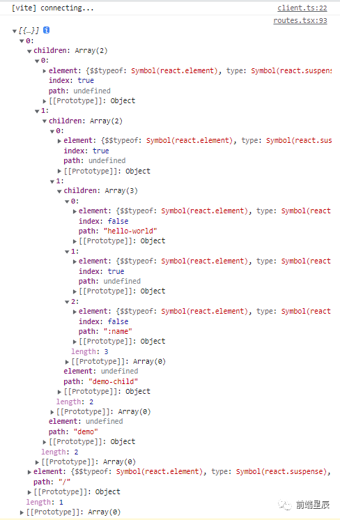 function generateRouteConfig(): RouteObject[] { const { $, ...pathConfig } = generatePathConfig(); // 提取跟路由的 layout return [ { path: '/', element: wrapSuspense($), children: mapPathConfigToRoute(pathConfig), }, ];}const routeConfig = generateRouteConfig();打印这个 routeConfig 配置试试: