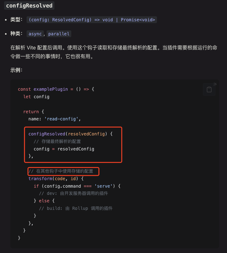 configResolved: https://cn.vitejs.dev/guide/api-plugin.html#configresolved