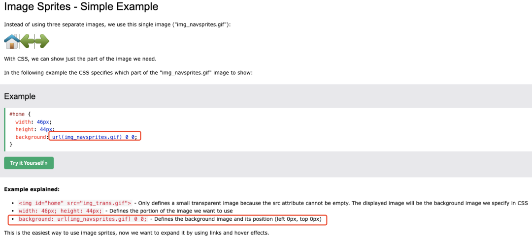 不知道,大家之前用过 Image Sprites[1],也就是我们常说的**「雪碧图」**。它能够把我们项目中用到的图片或者图标放置到一个图片中,然后依据图片位置来从中获取到我们像要展示的图片资源。