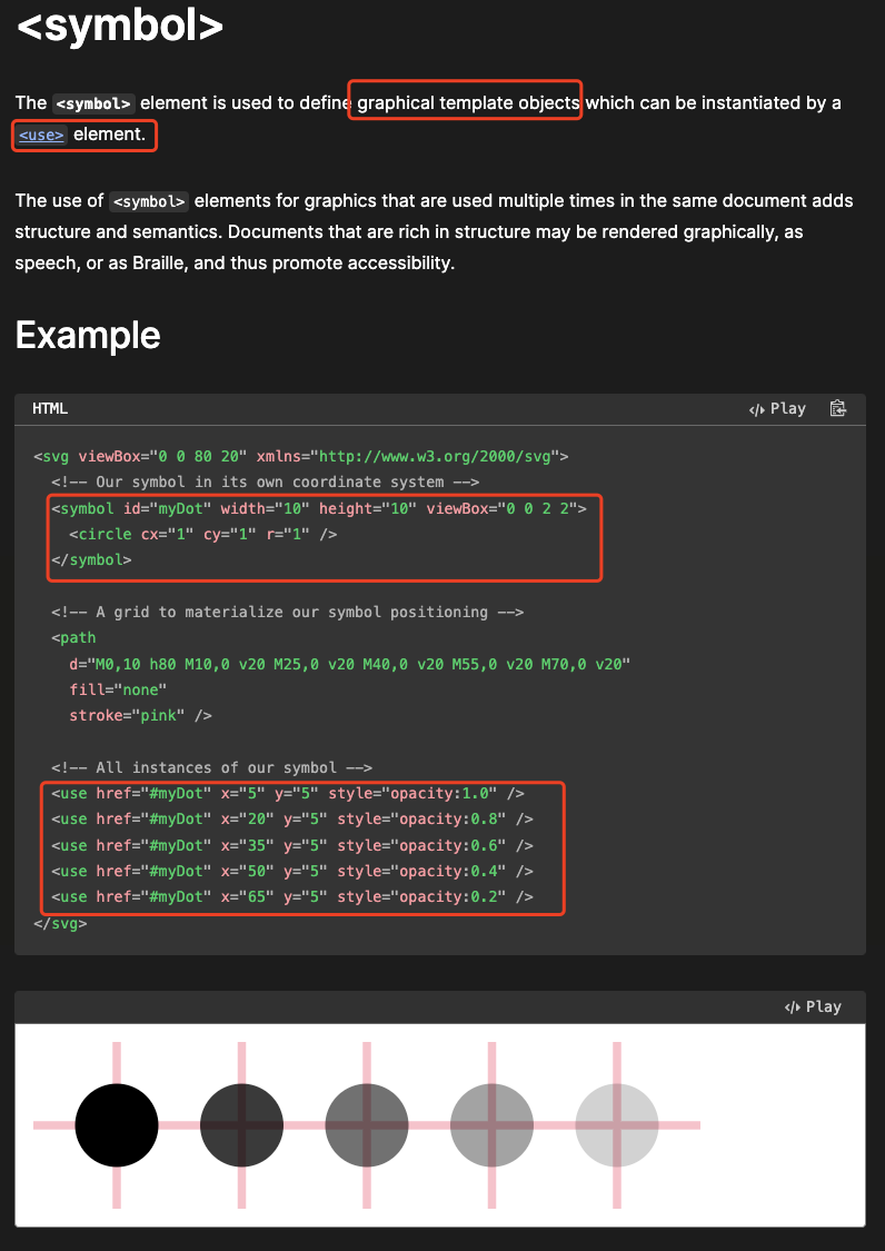 在svg的语言体系中,有一个定义图形模板的方式, 那就是使用 symbol[3], 然后我们可以使用<use>来引入该块的信息。