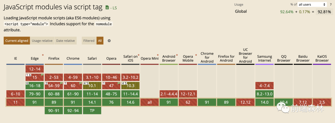 主流的浏览器(IE11 除外)均已经支持,其最大的特点是在浏览器端使用 export、 import的方式导入和导出模块,在 script 标签里设置 type="module",然后使用模块内容。