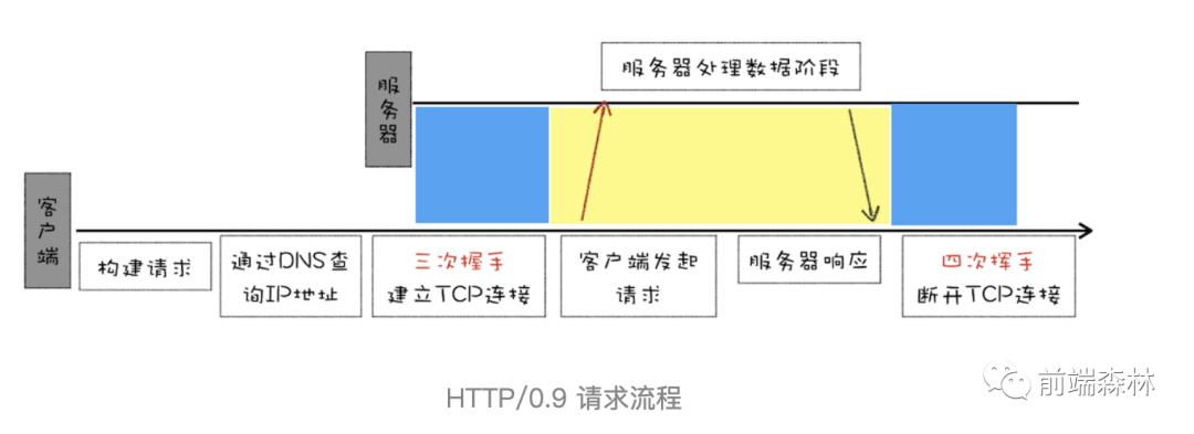最开始出现的HTTP/0.9实现相对较为简单:采用了基于请求响应的模式,从客户端发出请求,服务器返回数据。从图中可以看出其只有一个请求行且服务器也没有返回头信息。