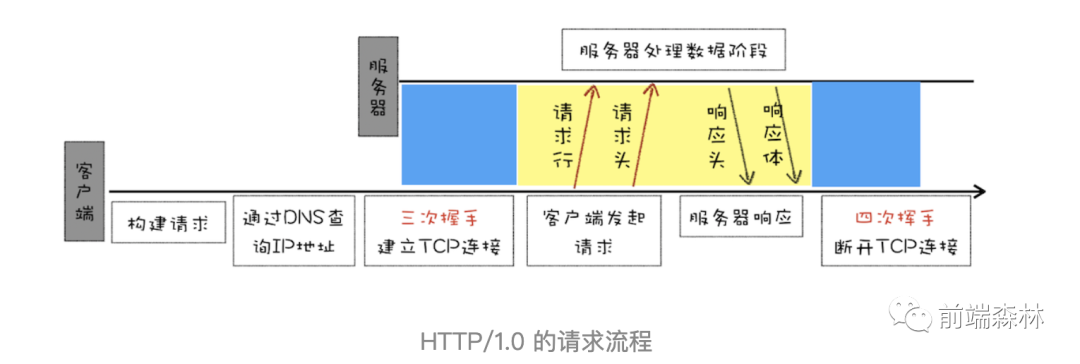 为了让客户端和服务器能更深入地交流,HTTP/1.0 引入了请求头和响应头,它们都是以 Key-Value 形式保存的,在 HTTP 发送请求时,会带上请求头信息,服务器返回数据时,会先返回响应头信息。HTTP/1.0 具体的请求流程可以参考下图: