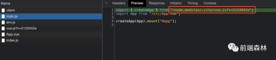 import { createApp } from "/node_modules/.vite/vue.js?v=2122042e";与以往的import { createApp } from "vue"不同,这里对引入的模块路径进行了重写: