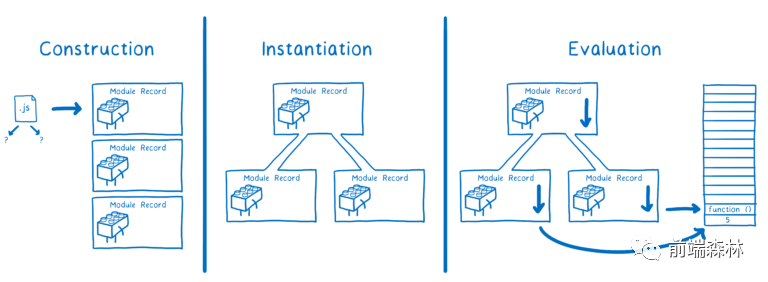 构造。查找、下载并解析所有文件到模块记录中。实例化。在内存中寻找一块区域来存储所有导出的变量(但还没有填充值)。然后让 export 和 import 都指向这些内存块。这个过程叫做链接(linking)。求值。运行代码,在内存块中填入变量的实际值。