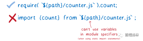 对于 ES 模块,在进行任何求值之前,你需要事先构建整个模块图。这意味着你的模块标识符中不能有变量,因为这些变量还没有值。