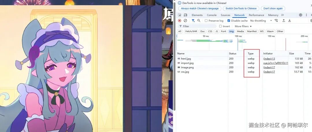 exportfunctiongetCacheKey({ name, ext, content}: any, factor: AnyObject) {const hash = crypto .createHash('md5') .update(content) .update(JSON.stringify(factor)) .digest('hex')return`${name}_${hash.slice(0, 8)}${ext}`}exportdefaultfunctionImageTools() { return { // hook configureServer(server) { server.middlewares.use(async (req, res, next) => { if (!filterImage(req.url || '')) return next() try { const filePath = decodeURIComponent( path.resolve(process.cwd(), req.url?.split('?')[0].slice(1) || '') ) // 过滤图片请求 ... const { ext, name } = parse(filePath) const file = readFileSync(filePath) // 获取图片缓存的key,就是图片hash的名称 const cacheKey = getCacheKey( { name, ext, content: file }, { quality, enableWebp, sharpConfig, enableDevWebp, ext } // 这里传生成hash的因子,方便后续改配置重新缓存图片 ) const cachePath = join('node_modules/.cache/vite-plugin-image', cacheKey) // 读缓存 if (existsSync(cachePath)) { return readFileSync(cachePath) } // 处理图片压缩和转webp,返回新的buffer const buffer = readFileSync(filePath) // 处理图片压缩和转webp,返回新的buffer,逻辑省略 const newBuffer = await pressBufferToImage(buffer) // 写入缓存 writeFile(cachePath, newBuffer, () => {}) ... }) }}效果