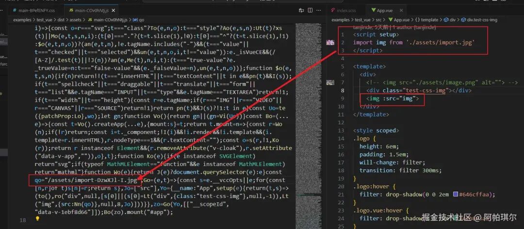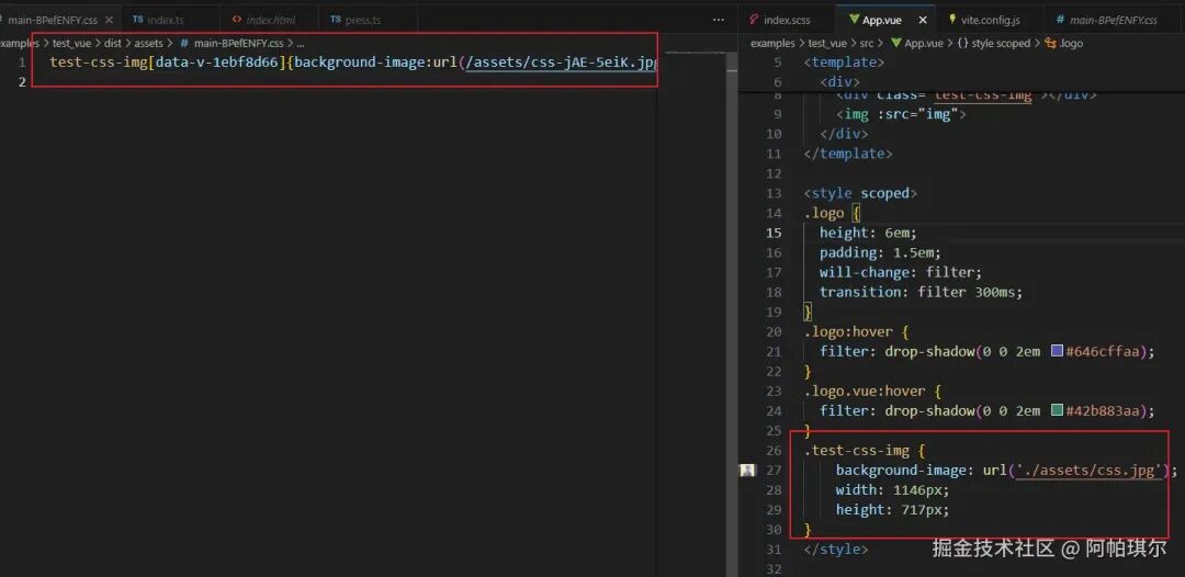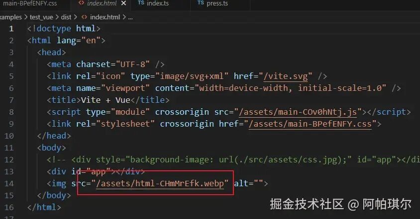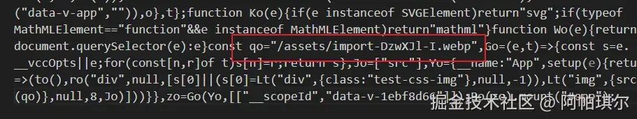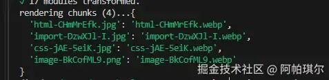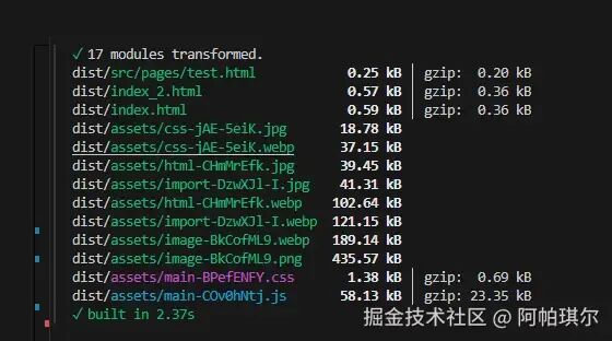 exportdefaultfunctionImageTools() { return { // hook async generateBundle(_options, bundle) { for (const key in bundle){ // 过滤图片key ... // 处理图片buffer ... /*webp相关逻辑*/ // 克隆原本的chunk const webpChunk = structuredClone(chunk) // 生成webp的buffer, 逻辑省略 const webpBuffer = await toWebpBuffer(chunk.source) // 更改新chunk的source和fileName webpChunk.source = webpBuffer const ext = extname(path) const webpName = key.replace(ext, '.wep') webpChunk.fileName = webpName // 添加到bundle中 bundle[webpName] = webpChunk } } }}3、** 替换路径后缀为.webp**:这里就有点麻烦,需要考虑图片的引入方式和打包的产物,解析产物去替换了
