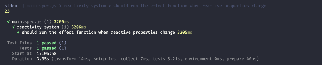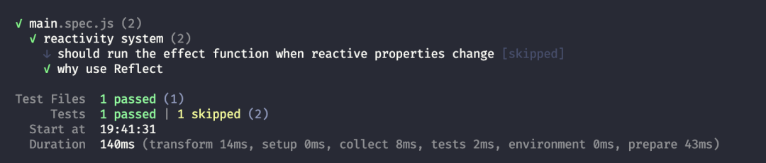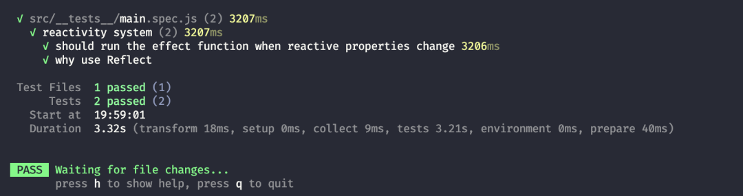 get(target, key) { consnt res = Reflect.get(target, key, receiver) // ... 其他不变 return res},set(target, key, newVal) { const res = Reflect.set(target, key, newVal, receiver) // ... 其他不变 return res},然后我们再次运行单测,就可以看到通过了