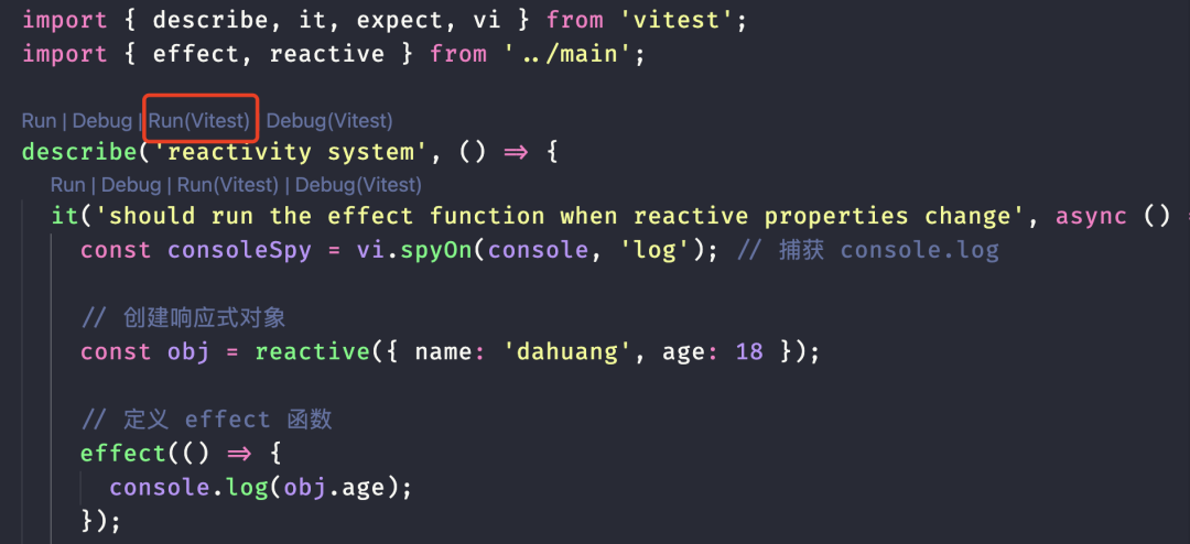 import { describe, it, expect, vi } from 'vitest';import { effect, reactive } from './main'; // 确保从您的 main.ts 文件中导入describe('reactivity system', () => { it('should run the effect function when reactive properties change', async () => { const consoleSpy = vi.spyOn(console, 'log'); // 创建一个监视 console.log 调用的 spy // 创建响应式对象 const obj = reactive({ name: 'dahuang', age: 18 }); // 定义 effect 函数 effect(() => { console.log(obj.age); }); // 检查 effect 是否立即执行 expect(consoleSpy).toHaveBeenCalledWith(18); // 更改 age 属性并等待 setTimeout(() => { obj.age = 23; }, 1000); await new Promise((r) => setTimeout(r, 1100)); // 等待上述 setTimeout 完成 // 检查 effect 是否在 age 改变时再次执行 expect(consoleSpy).toHaveBeenCalledWith(23); // 更改 address 属性并等待 setTimeout(() => { obj.address = 'beijing'; }, 2000); await new Promise((r) => setTimeout(r, 2100)); // 验证 effect 没有因 address 改变而执行 expect(consoleSpy).toHaveBeenCalledTimes(2); consoleSpy.mockRestore(); // 清除 mock });});解释一下这些内容: