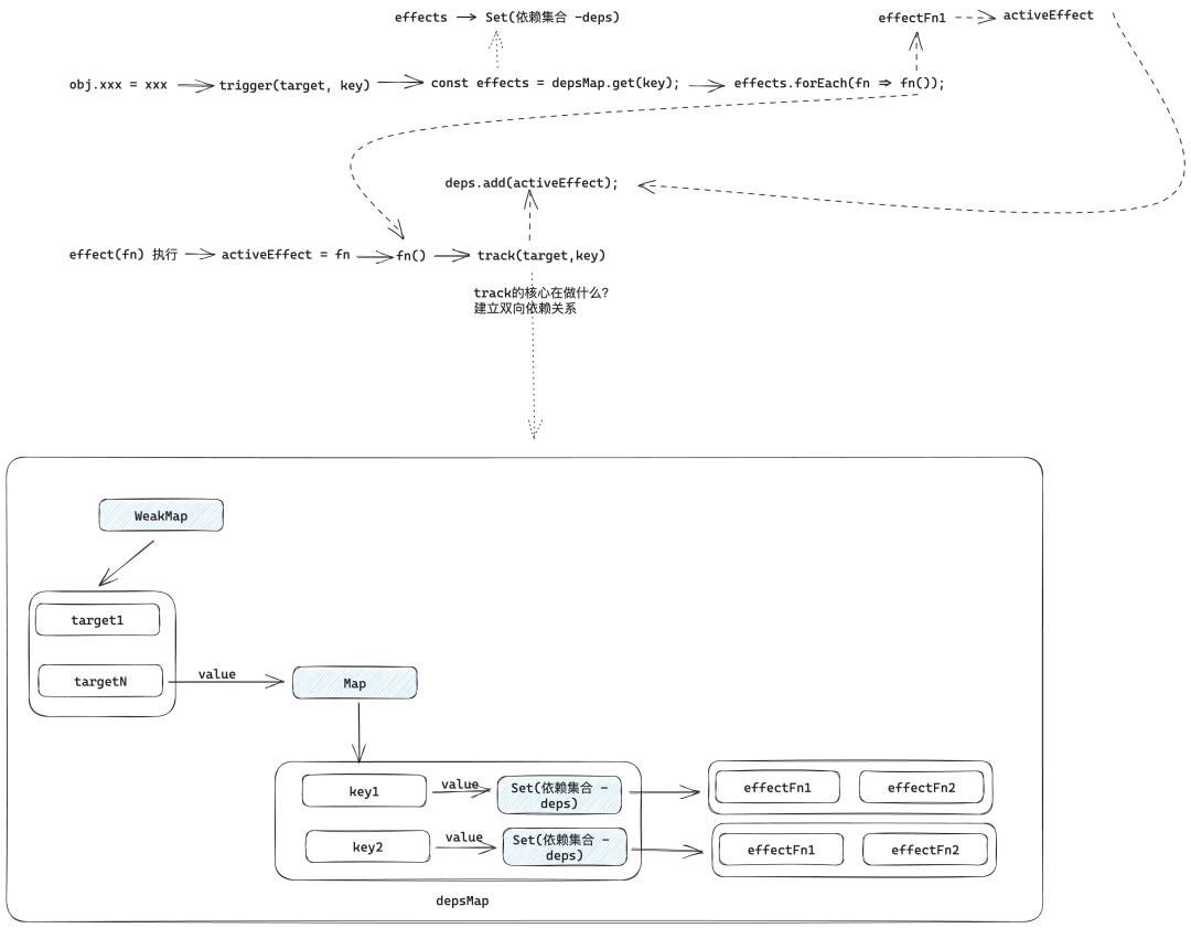 function track(target, key) { // 没有 activeEffect,直接返回 if (!activeEffect) return target[key]; // 根据 target 从“桶”中取得 depsMap,它也是一个 Map 类型:key --> effects let depsMap = bucket.get(target); // 如果不存在 depsMap,那么新建一个 Map 并与 target 关联 if (!depsMap) { bucket.set(target, (depsMap = new Map())); } // 再根据 key 从 depsMap 中取得 deps,它是一个 Set 类型, // 里面存储着所有与当前 key 相关联的副作用函数:effects let deps = depsMap.get(key); // 如果 deps 不存在,同样新建一个 Set 并与 key 关联 if (!deps) { depsMap.set(key, (deps = new Set())); } // 最后将当前激活的副作用函数添加到“桶”里 deps.add(activeEffect);}function trigger(target, key) { // 根据 target 从桶中取得 depsMap,它是 key --> effects const depsMap = bucket.get(target); if (!depsMap) return; // 根据 key 取得所有副作用函数 effects const effects = depsMap.get(key); // 执行副作用函数 effects && effects.forEach((fn) => fn());}// 对原始数据的代理export function reactive(target) { return new Proxy(target, { // 拦截读取操作 get(target, key, receiver) { const res = Reflect.get(target, key, receiver); // 依赖收集 track(target, key); return res; }, // 拦截设置操作 set(target, key, newVal, receiver) { // 设置属性值 const res = Reflect.set(target, key, newVal, receiver); // 派发更新 trigger(target, key); return res; }, });}分别把逻辑封装到 track 和 trigger 函数内,这能为我们带来极大的灵活性。