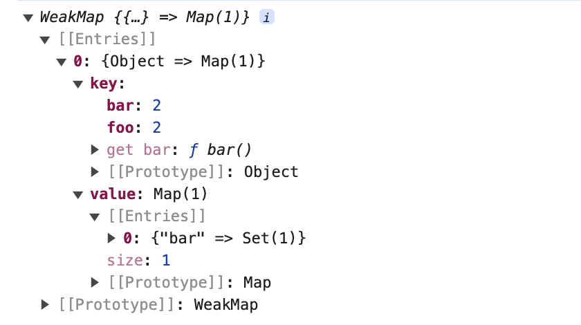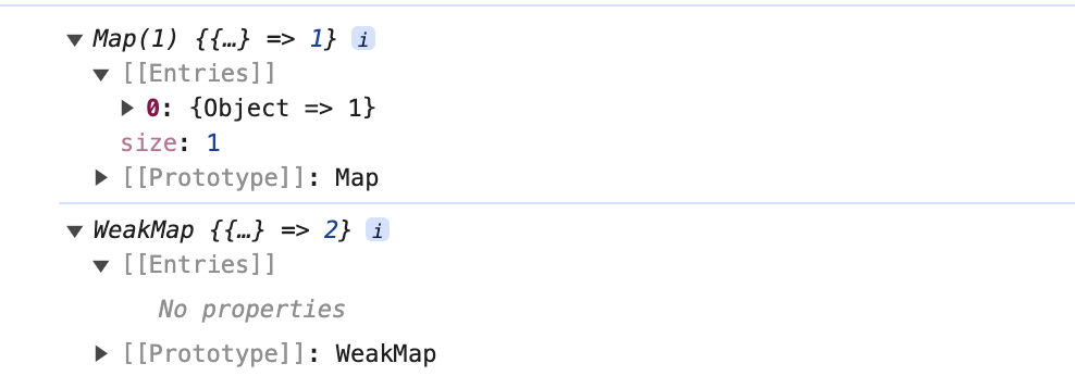 <!DOCTYPE html><html lang="en"><head> <meta charset="UTF-8"> <meta > <title>Document</title></head><body> <script> const map = new Map(); const weakmap = new WeakMap(); (function () { const foo = { foo: 1 }; const bar = { bar: 2 }; map.set(foo, 1); weakmap.set(bar, 2); })(); console.log(map); console.log(weakmap); </script></body></html>当该函数表达式执行完毕后,对于对象 foo 来说,它仍然作为 map 的 key 被引用着,因此垃圾回收器(grabage collector)不会把它从内存中移除,我们仍然可以通过 map.keys 打印出对象 foo。然而对于对象 bar来说,由于WeakMap的 key 是弱引用,它不影响垃圾回收器的工作,所以一旦表达式执行完毕,垃圾回收器就会把对象 bar从内存中移除,并且我们无法获取 WeakMap的 key 值,也就无法通过 WeakMap取得对象 bar。