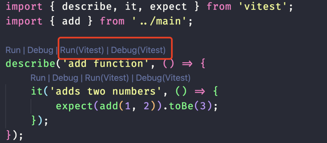 import { describe, it, expect } from 'vitest';import { add } from '../main';describe('add function', () => { it('adds two numbers', () => { expect(add(1, 2)).toBe(3); });});点击运行单测: