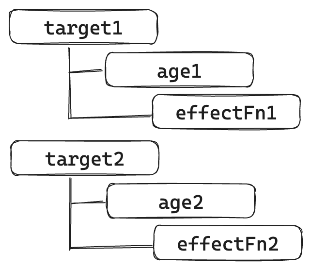 effect(function effectFn1() { console.log(obj1.age1);})effect(function effectFn2() { console.log(obj2.age2);})那么关系如下: