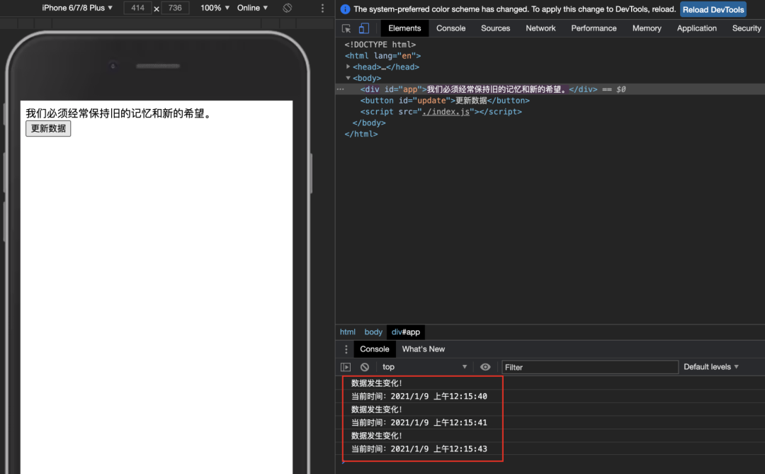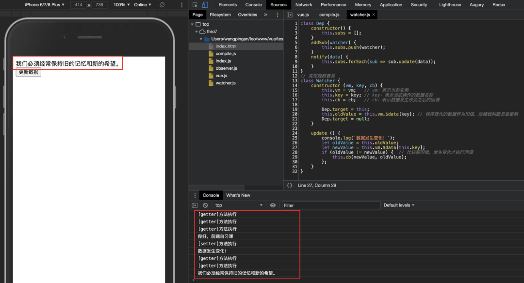 // 初始化测试数据let initData = { text: '你好,前端自习课', desc: '每日清晨,享受一篇前端优秀文章。'};const app = document.querySelector('#app');// 步骤1:为测试数据转换为响应式对象new Observer(app, initData);// 步骤2:初始化页面文本内容app.innerText = initData.text;// 步骤3:绑定按钮事件,点击触发测试document.querySelector('#update').addEventListener('click', function(){ initData.text = `我们必须经常保持旧的记忆和新的希望。`; console.log(`当前时间:${new Date().toLocaleString()}`)})测试代码中,核心在于通过实例化 Observer,将测试数据转换为响应式数据,然后模拟数据变化,来观察视图变化。 每次点击 “更新数据” 按钮,在控制台中都能看到 “数据发生变化!” 的提示,说明我们已经能通过 setter 观察到数据的变化情况。