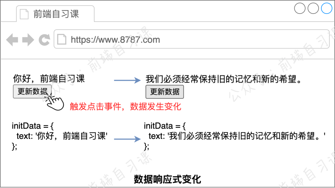 前面反复提到 “通过改变数据,来自动更新视图”,换个说法就是 “数据改变后,使用该数据的地方被动发生响应,更新视图”。
