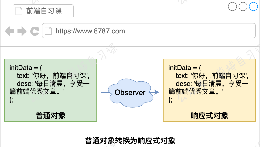 let initData = { text: '你好,前端自习课', desc: '每日清晨,享受一篇前端优秀文章。'};接下来实现 Observer 类: