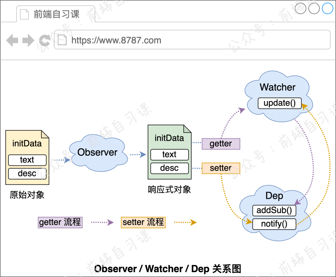 Dep被观察者类,提供用来收集观察者(addSub)方法和通知观察者(notify)方法;Watcher观察者类,实例化时支持传入回调(cb)方法,并提供更新(update)方法;
