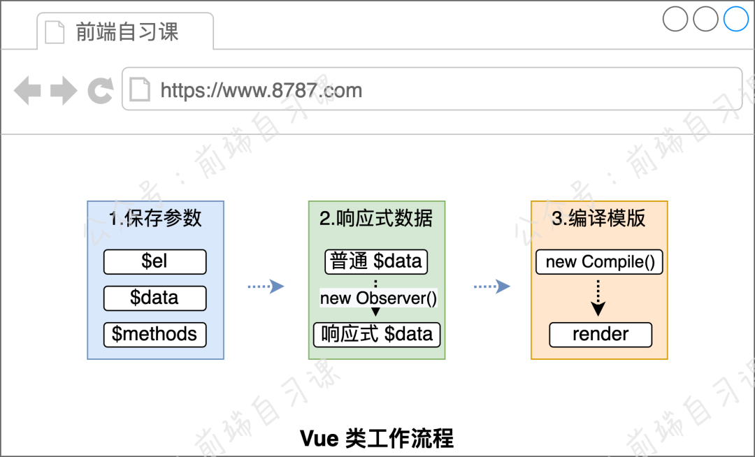 通过实例化 Oberser 类,将普通 data 对象转换为响应式对象,然后判断是否传入 el 参数,存在时,则实例化 Compile 类,解析模版内容。