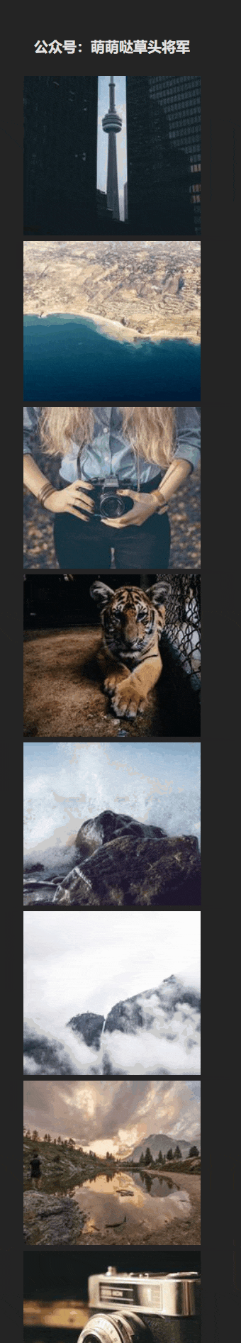 import { onMounted, Ref } from "vue";const options = { // root: document.querySelector(".container"), // 根元素,默认为视口 rootMargin: "0px", // 根元素的边距 threshold: 0.5, // 可见性比例阈值 once: true,};function callback( entries: IntersectionObserverEntry[], observer: IntersectionObserver) { entries.forEach((entry) => { // 处理每个目标元素的可见性变化 if (entry.intersectionRatio <= 0) return; const img: Element = entry.target; const src = img.getAttribute("data-src"); img.setAttribute("src", src ?? ""); // 将真实的图片地址赋给 src 属性 observer.unobserve(img); });}export const useInView = (ref: Ref) => { const observer = new IntersectionObserver(callback, options); onMounted(() => { Object.keys(ref.value).forEach((e) => observer.observe(ref.value[e])); });};<script setup lang="ts">import { ref } from "vue";import { useInView } from "./hooks/useInView";const imgRef = ref(null);useInView(imgRef);</script><template> <h4>公众号:萌萌哒草头将军</h4> <div v-for="(_, idx) in new Array(200).fill(11)" > <img ref="imgRef" src="https://via.placeholder.com/200" :data-src="`https://picsum.photos/200/${180 + idx}`" alt="b" /> </div></template>实际效果如下
