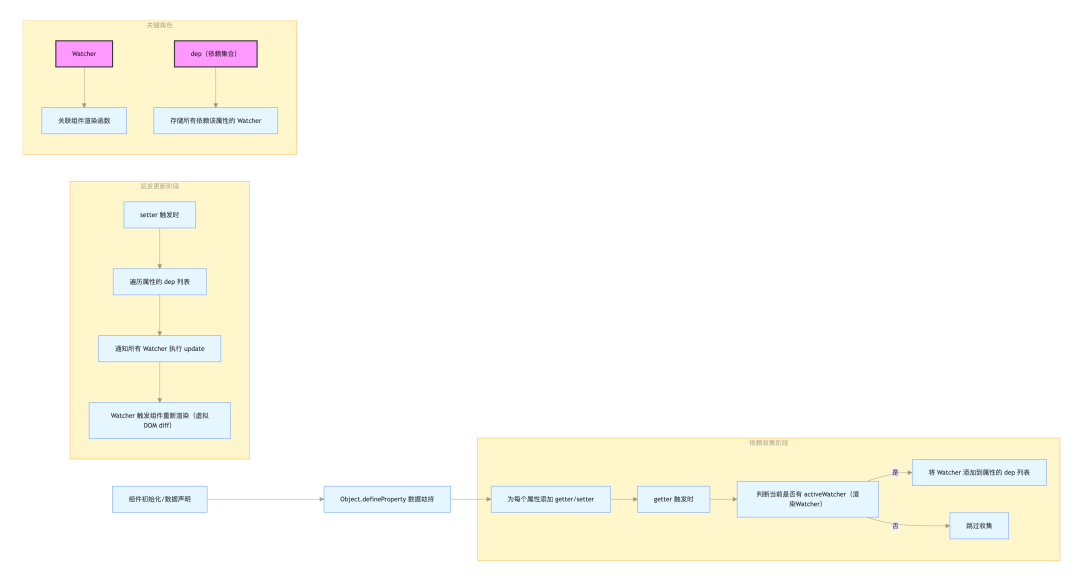 Watcher:与组件渲染函数绑定的监听器,负责在数据变化时触发组件更新。