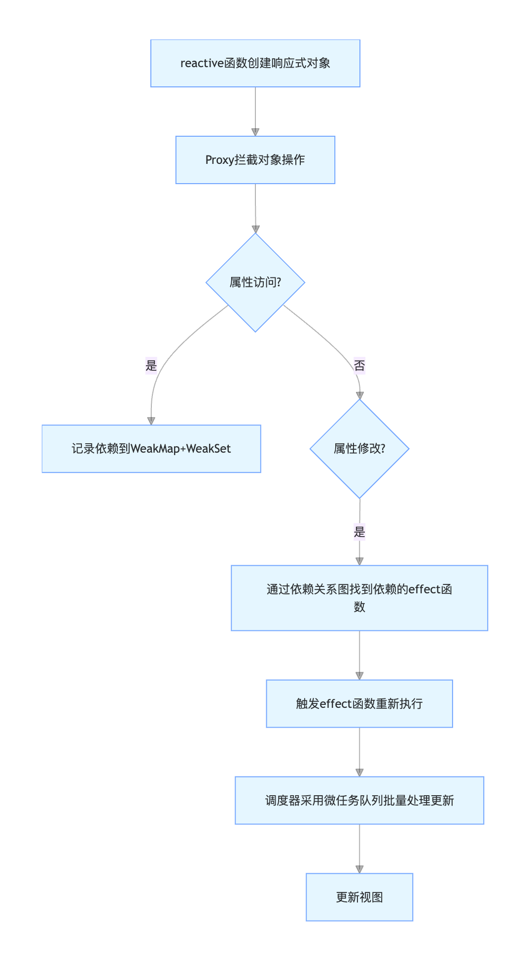 reactive、ref等 API 创建响应式对象,本质是用Proxy代理目标对象。Proxy拦截范围:包括属性访问、修改、删除等操作。
