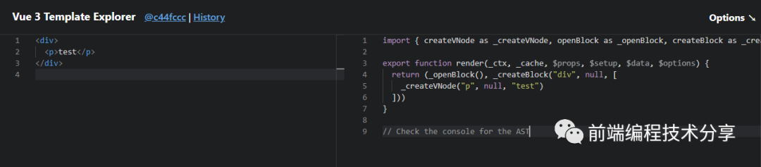 例如,假设它现在正在转换的是一个注释节点,它会执行 context.helper(CREATE_COMMENT),内部实现相当于 helpers.add('createCommentVNode')。然后在 codegen 阶段,遍历 helpers,将程序需要的函数从 Vue 里导入,代码实现如下: