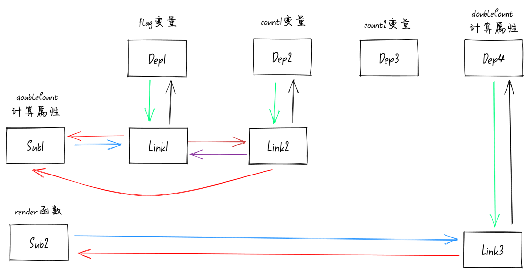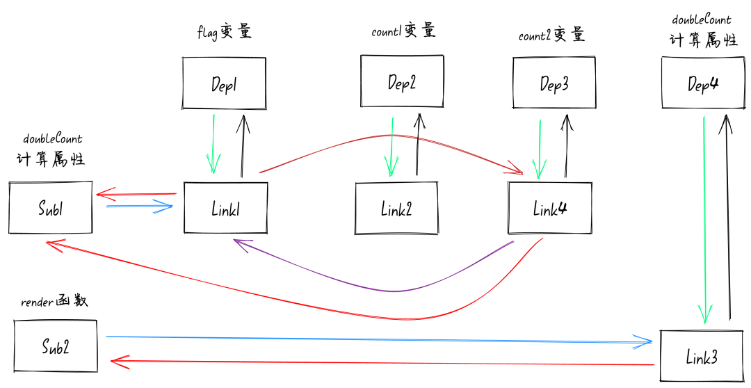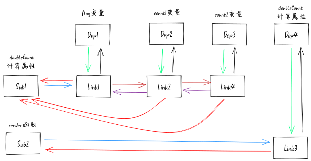 function isDirty(sub: Subscriber): boolean { for (let link = sub.deps; link; link = link.nextDep) { if ( link.dep.version !== link.version || (link.dep.computed && (refreshComputed(link.dep.computed) || link.dep.version !== link.version)) ) { return true; } } return false;}这里就涉及到我们上一节讲过的双向链表了,回顾一下前面讲过的响应式模型图,如下图:此时的 sub 订阅者是 render 函数,也就是图中的