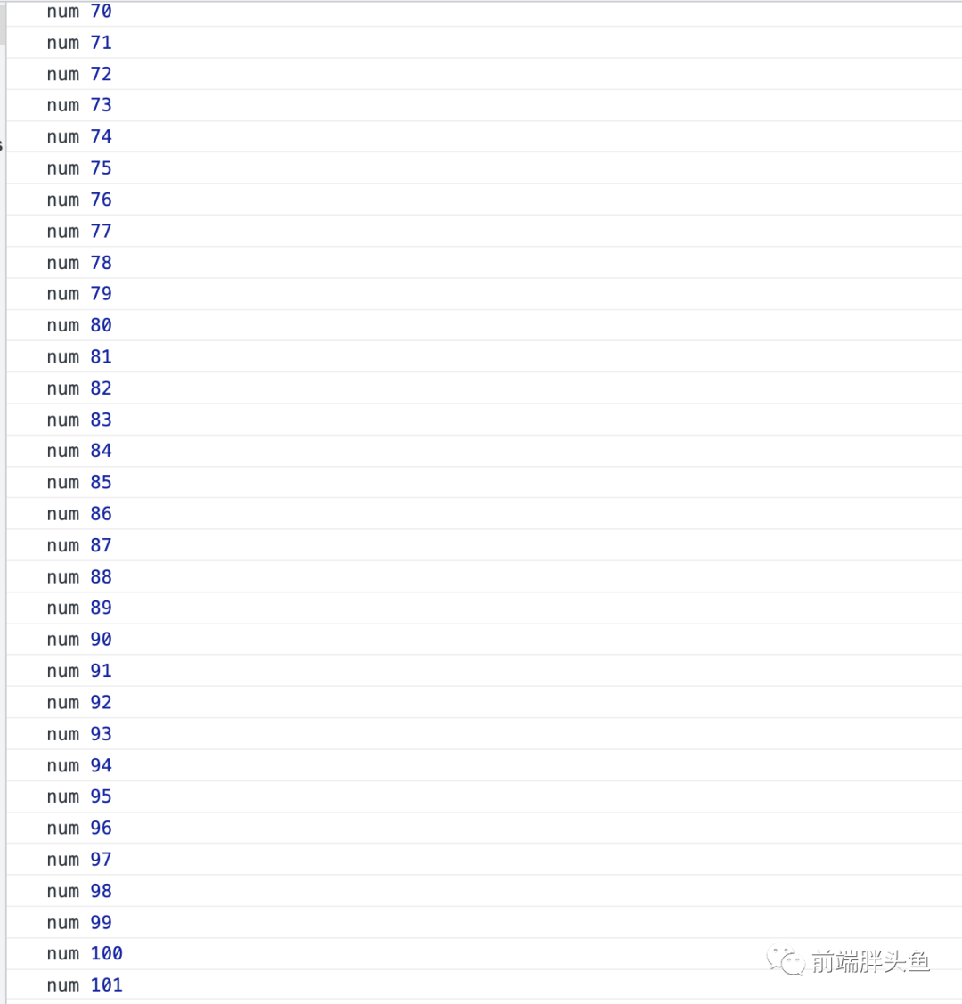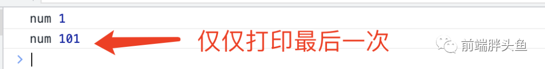 利用 Promise 微任务的特性,当 num 被更改 100 次之后同步代码全部执行结束后,then 回调将会被执行,此时 num 已经是 101,而 jobQueue 中也只有一个 fn,所以最终只会打印一次 101