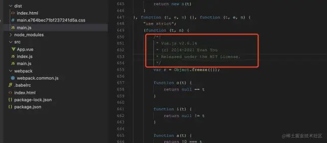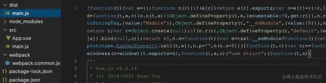 externals: { 'vue': 'Vue',}复制代码npm run build打包后的结果验证:设置 externals 后,dist 内找不到 vue.js 的 package 包了。下图为设置前的截图