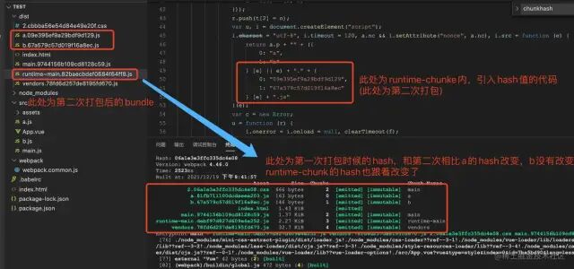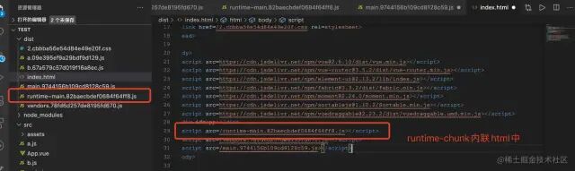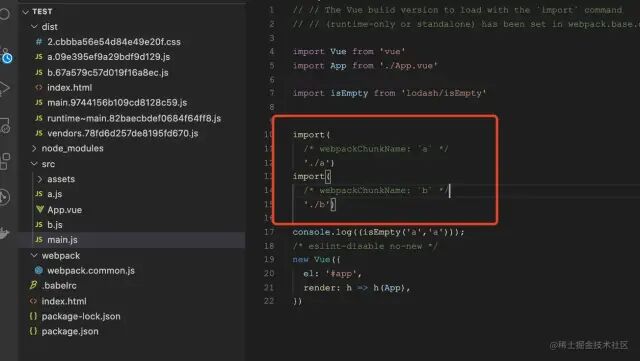 const ScriptExtHtmlWebpackPlugin = require('script-ext-html-webpack-plugin')output: { path: path.resolve(__dirname, '../dist'), filename: '[name].[chunkhash].js', chunkFilename: '[name].[chunkhash].js', publicPath: '/'},plugins:[ new ScriptExtHtmlWebpackPlugin({ inline: /runtime\..*\.js$/ }),],optimization: { runtimeChunk: true, // 构建出runtime~xx文件 splitChunks: { name: true, // 自动处理文件名 chunks: 'all', automaticNameDelimiter: '-', cacheGroups: { vendors: { test: /[\\/]node_modules[\\/]/, priority: 10, name: 'vendors', chunks: 'initial' }, commons: { name: 'commons', minChunks: 2, priority: 5, test: path.join(__dirname, '..', 'src/components'), reuseExistingChunk: true } } } }复制代码先在 src 下创建a.js、b.js文件, 在main.js通过 动态加载 import()引入,webpackChunkName为按需引入后打包的名称。npm run build打包后, runtimeChunk 的结果验证